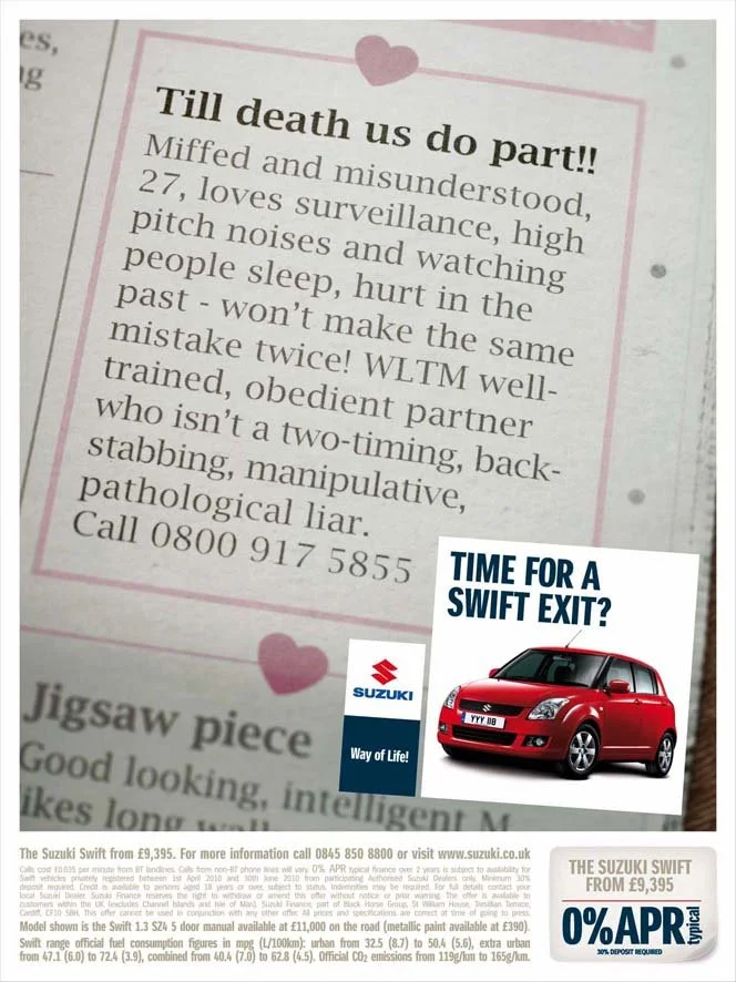 The following work ran as part of the ‘Time for a Swift exit?’ campaign and helped to sell many of its flagship cars.